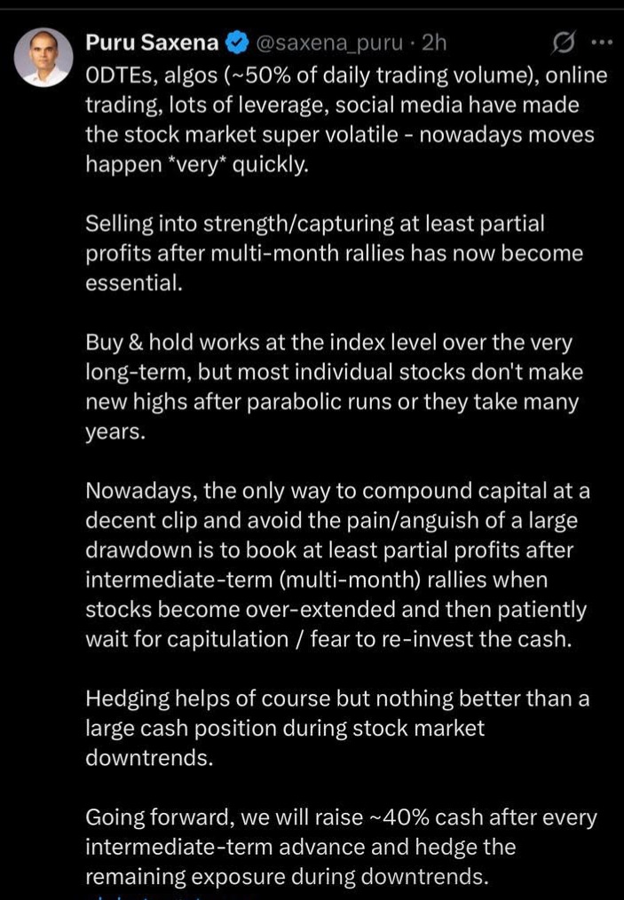 - More recently I am exploring the idea of raising cash at Portfolio level when broad valuations look elevated e.g. Dec 2024 S&P PE : 28 was around historical highs + Technicals show market momentum slowing down + Lurking Macro dangers (recently it was Tariffs and Refinancing of 30% of US treasuries). Only danger is we never know which bubble goes longer than anyone expects.