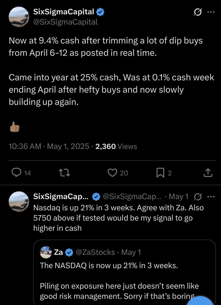 Markets already rallying 20%+ from the bottoms and Bill Ackman calling for pause on China Tariffs make me wonder if market knows something that I don’t. Technicals show we made a higher low on the major indices and the market timing strategy I follow flipped to long term buy. I am torn between doing nothing vs deploying more cash to work.